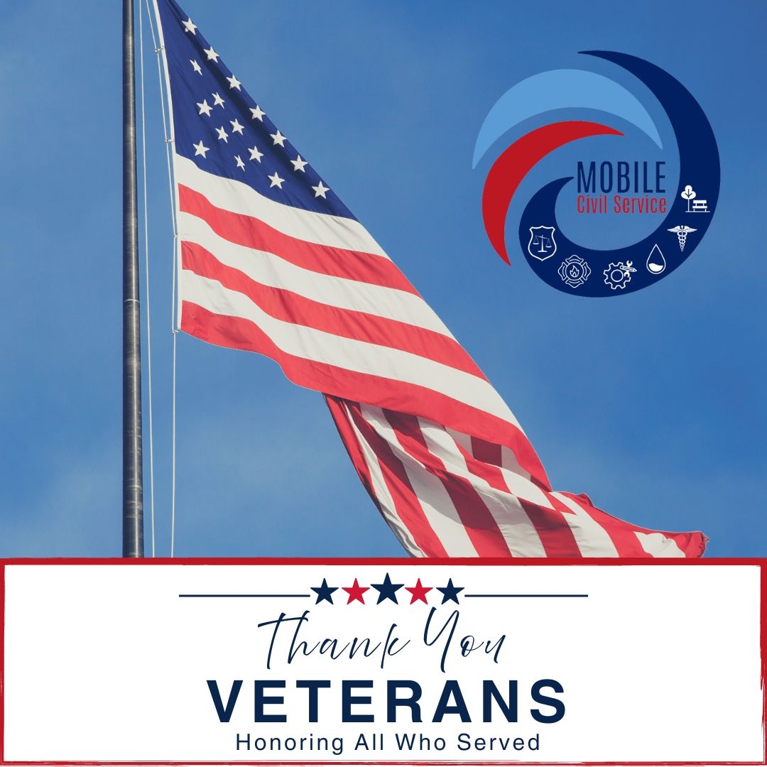 The Mobile Civil Service will be closed on Tuesday, November 11, 2025, in observance of Veterans Day. We are thankful for the service of our men and women and wish you and your family a happy and safe holiday.
